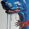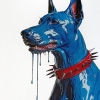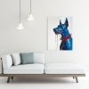 The Doberman is depicted in an unusual, vivid blue color, as if its essence has transformed into a molten, liquid substance. The dog's fur is shown not in a traditional realistic style, but as a shiny, smooth surface, with drops of oil paint dripping from it, creating a sense of dynamic movement and surreal transformation.