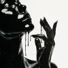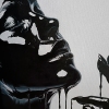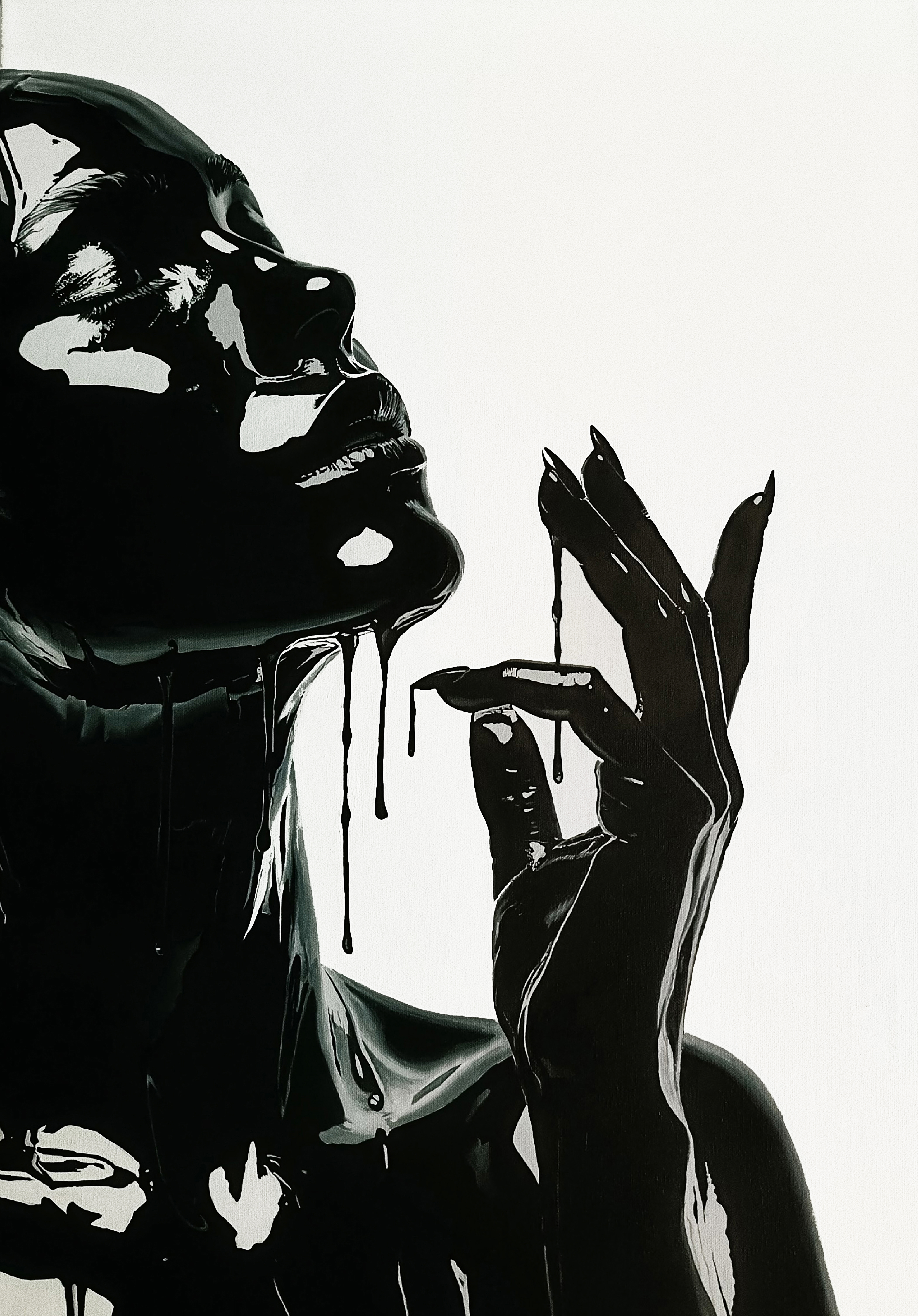 A minimalist monochrome oil painting on canvas. It depicts a portrait of a woman whose figure seems immersed in a liquid black substance, creating a sense of graceful movement. The bright white background emphasizes the purity and simplicity of the composition. Soft drops and smooth lines create a calming, serene atmosphere, conveying a feeling of peace and unhurried contentment.