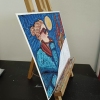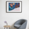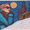 A bright and expressive painting made with oil pastels and acrylic on paper. A woman wearing sunglasses and a blue coat is looking away from a night sky with a yellow moon. To the right is a log cabin covered in snow and orange-red spruces. The style is very textured, with noticeable pastel strokes and strong color contrast. The atmosphere is dynamic and wintery.