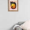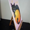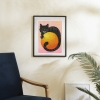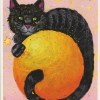 A bright textured illustration for a children's room, created with oil pastels and acrylics on paper. A fluffy black cat is hugging a huge glowing yellow-orange sun. The cat has green eyes. The background is a soft pink color with yellow stars. The style is naive, expressive, with visible brush strokes and a warm, handmade texture.