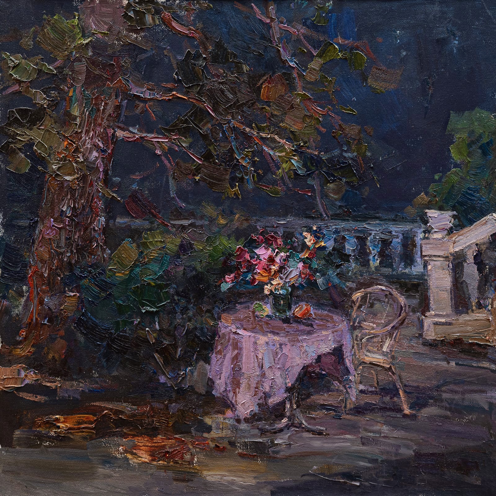 The painting "Night Still Life by the Sea" conveys an atmosphere of secluded romance and the magic of the night. In the center of the composition is a table covered with a delicate lilac tablecloth, on which stands a bouquet of bright flowers. They stand out with their rich color against the dark palette of the painting, creating a point of attraction for the eye.