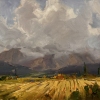 The painting "In the Autumn Clouds" perfectly conveys the autumn mood with its changeable weather and special atmosphere. In the foreground there is a golden field, illuminated by soft light, where freshly mown areas and collected sheaves are visible. These warm shades emphasize the fruitful generosity of autumn.