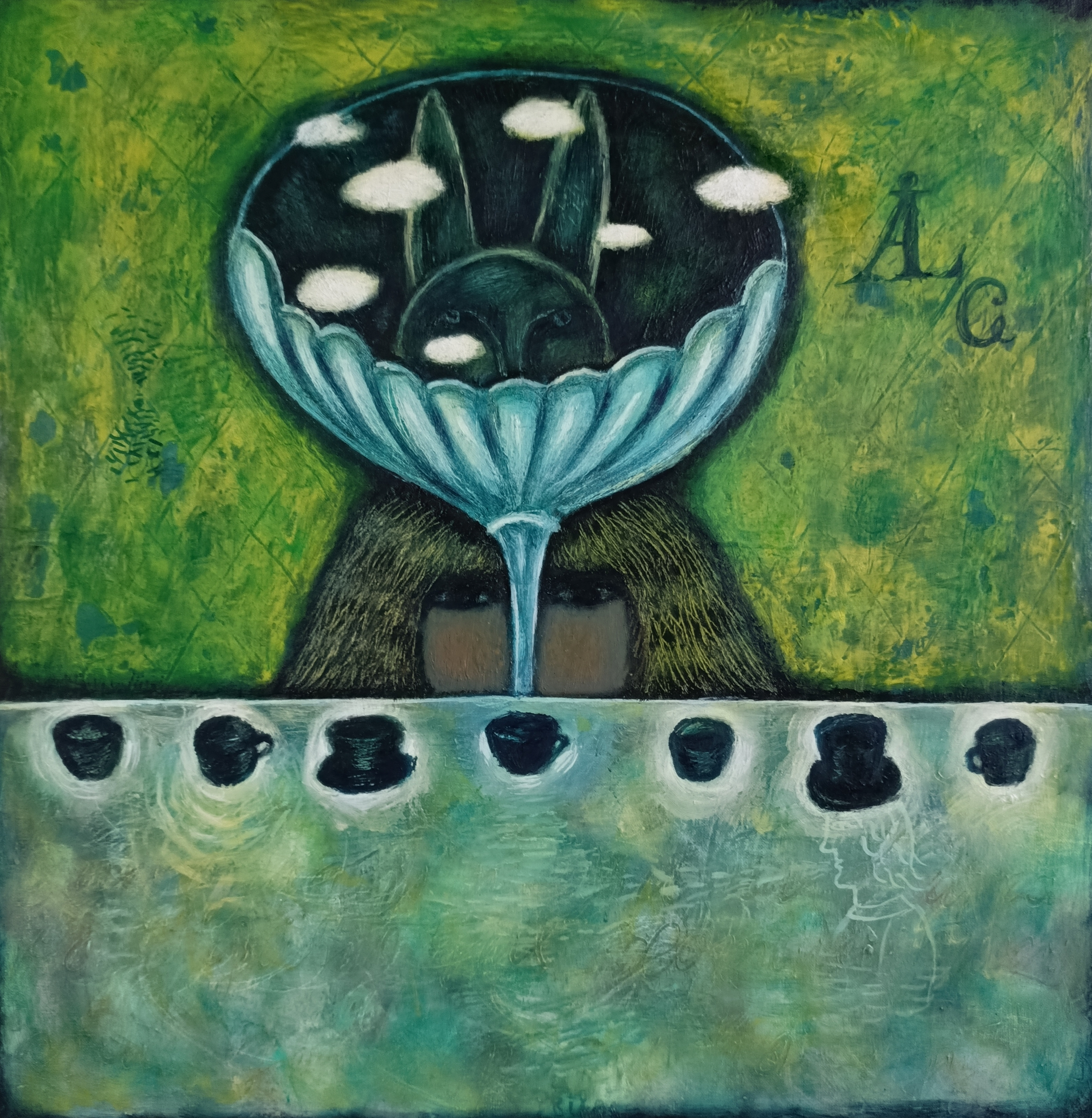 At the center of the composition is a figure resembling a rabbit, possibly the White Rabbit from «Alice in Wonderland». Its eyes, painted in dark tones, peek out from under a hat or a cup, creating a sense of mystery and slight anxiety. The rabbit’s face, rendered in dark shades, appears enigmatic and somewhat unsettling. Above it, inside the cup, clouds can be seen, giving the entire scene a surreal character.