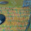 «The rabbit hole» by Vasily Prilepa is a deeply literary, almost philosophical canvas, referencing the world of Lewis Carroll. The artist transforms a familiar story into a metaphor for the transition between realities. The composition is vertical: at the top is a bright, sun-scorched field, and in the center is a dark hole leading deep down, where the white rabbit is rushing.