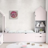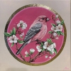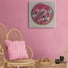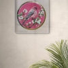 At the center of the composition, against a deep pink circle, a small bird is depicted. Its plumage is rendered in delicate pinkish-lilac tones, giving it a magical, paradisiacal appearance. The detailing of the feathers, especially on the wings, is masterfully done, emphasizing the contrast between the soft body and the structural gray strokes on the wings. The bird is shown perched on a branch, with its head bowed, creating a sense of calm and natural grace.