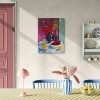 The background of the painting is divided into two zones, enhancing the contrast of the composition. The left part is rendered in a deep, saturated purple or magenta color, creating a warm, intimate atmosphere. The right part is cooler, turquoise-blue, reminiscent of fabric or a curtain.