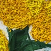 The painting depicts a sunny still life, painted in oil using an unusual technique — thin streams of paint, squeezed out with a culinary syringe, create voluminous, layered «golden balls». Bright yellow flowers are gathered into an expressive bouquet standing in a large, richly red bottle, serving as a vivid focal point of the composition.
