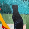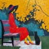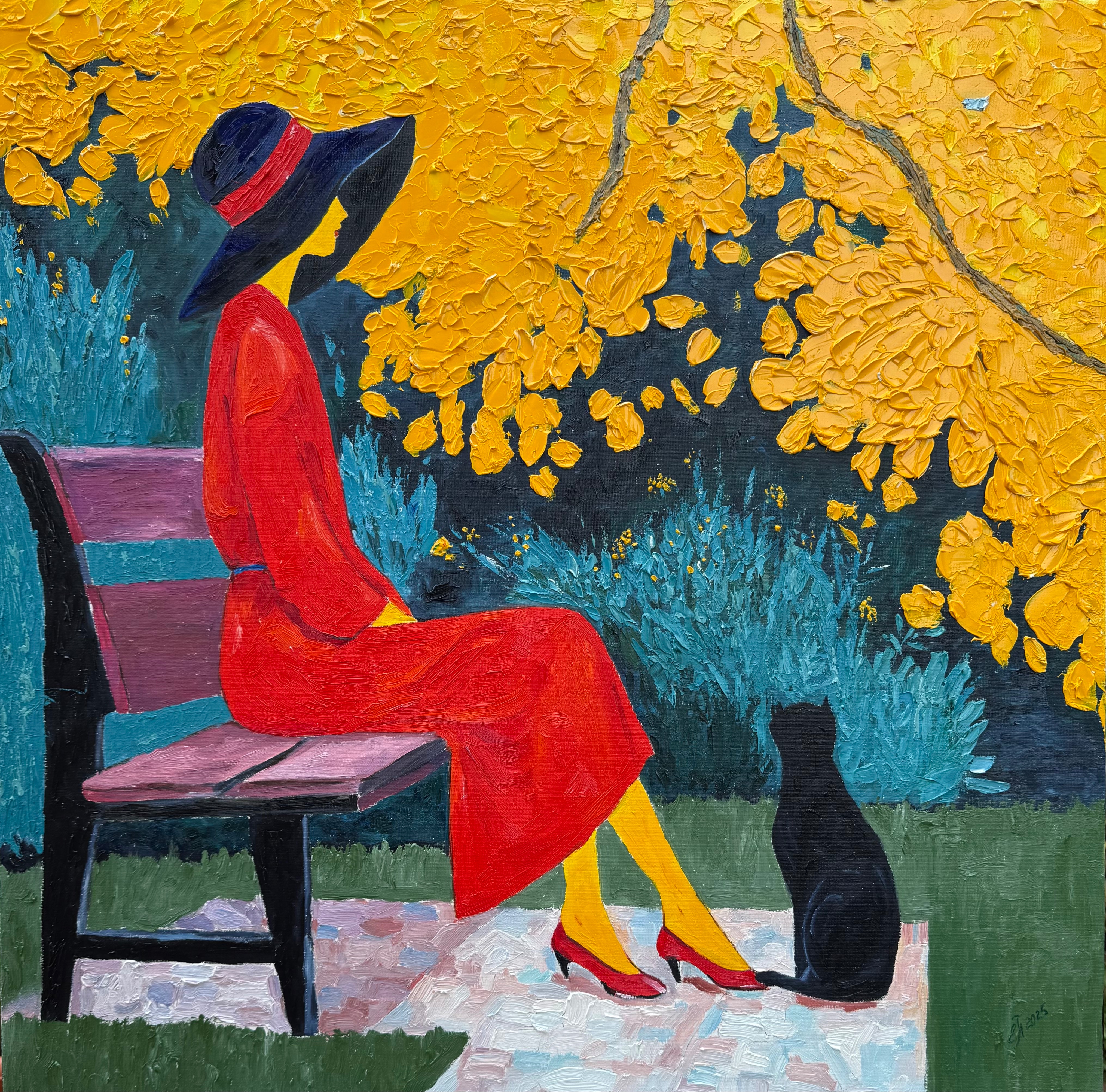 The canvas depicts a female figure in a red dress and a black wide-brimmed hat, sitting on a bench in an autumn park. The heroine’s face is hidden from the viewer — this technique strips the image of individuality, turning it into a universal symbol of an inner state. Next to her is a black cat, a quiet and attentive companion, enhancing the feeling of solitude and contemplation.