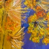 Simple yellow flowers in a vase add lightness and naive joy to the composition, while the yellow-lilac wall in the background emphasizes the decorative character and modernity of the piece. The red tablecloth enhances the painting’s energy, filling it with warmth, passion, and vitality.