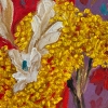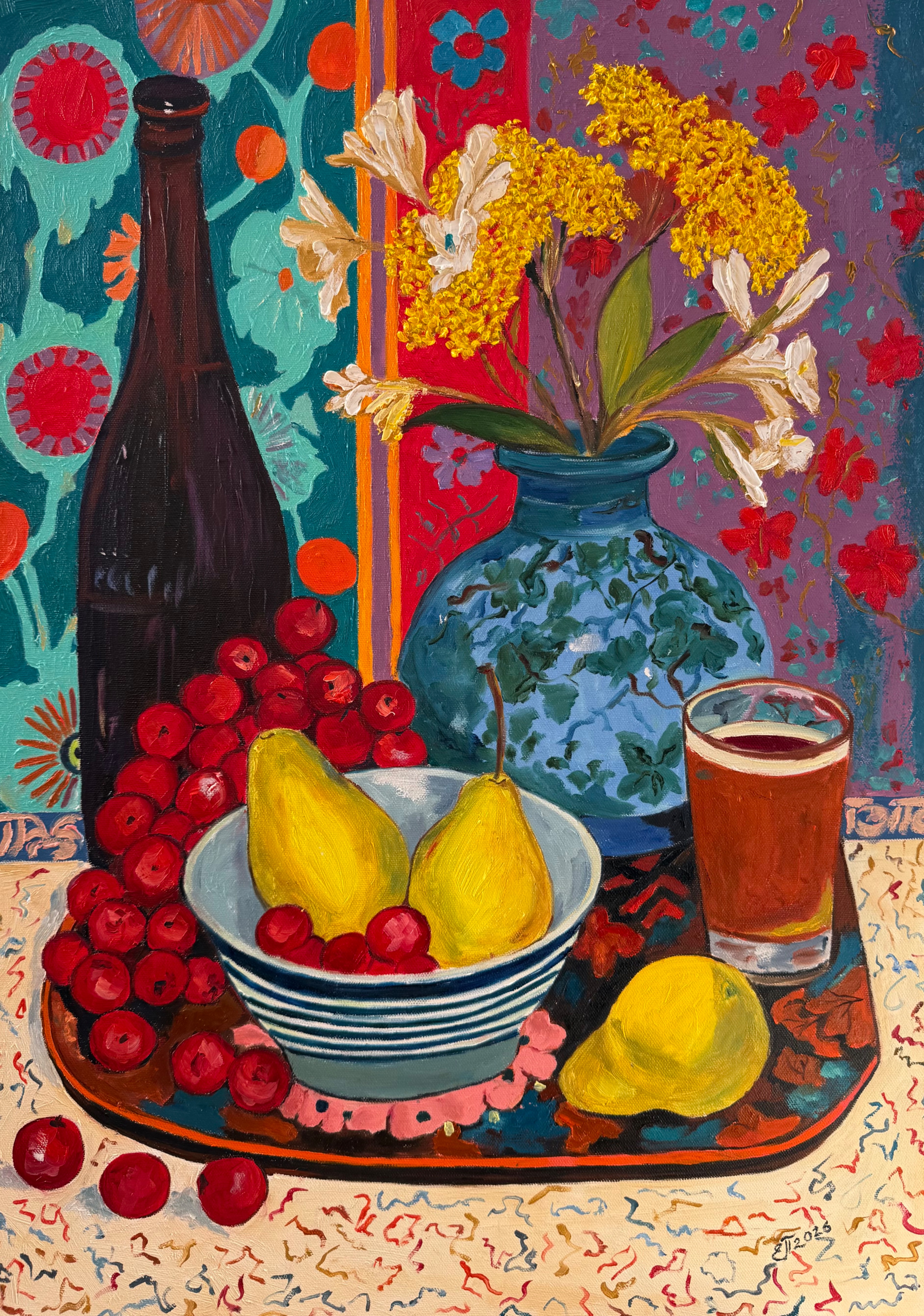 This still life is filled with a sense of coziness, warmth, and quiet joy. The yellow flowers in the vase become a source of light within the composition, as if illuminating the space from within. The tray on the table unites simple yet expressive elements: a glass with a drink, juicy pears, and scattered red ranetki apples, adding rhythm and a bright accent of color.