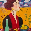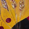 In front of the girl stands a table covered with a tablecloth. On it lie wildflowers, a bowl of ripe cherries, lemons, and a vase with wheat ears. This still life seems to connect home and nature, the inner world and the vastness of the outside world. The wheat ears echo the field behind her, while the juicy fruits add warmth and vitality to the composition.