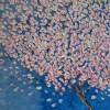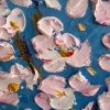 A minimalist spring composition dedicated to the moment of blooming and renewal. It depicts a cherry blossom branch with white and pink petals, lushly flowering against a clear blue sky. The space around the branch is intentionally left empty—the air, light, and silence become equal protagonists of the piece.