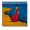 Девушка в развевающемся красном платье стоит на берегу, глядя вдаль на изумрудно-голубое море. Морской бриз касается её ткани и волос, наполняя композицию движением и дыханием пространства. Ярко-жёлтый берег словно отделяет землю от воды — реальность от мечты.