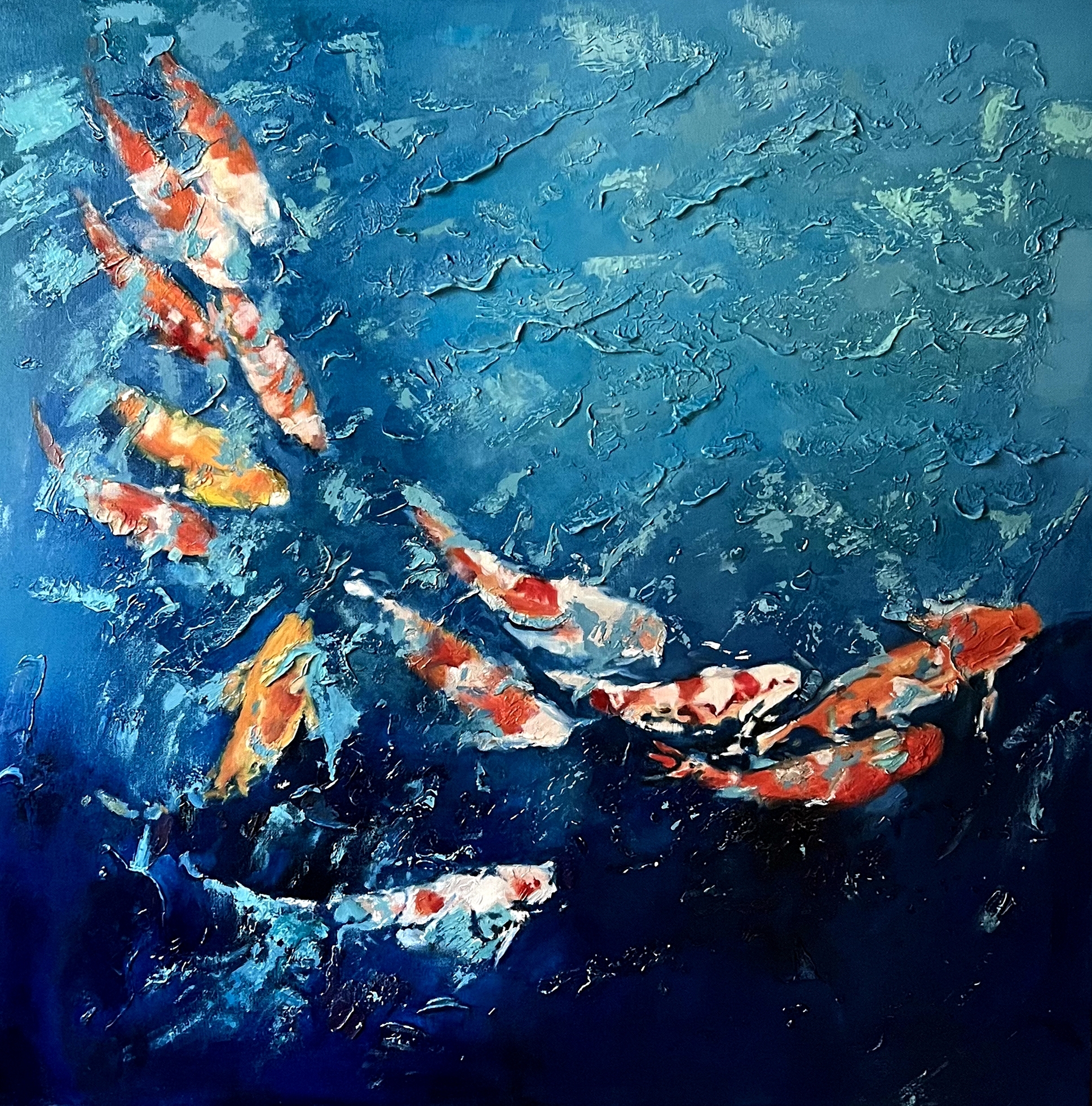 A mesmerizing textured painting where goldfish play and dance in mysterious blue waters.