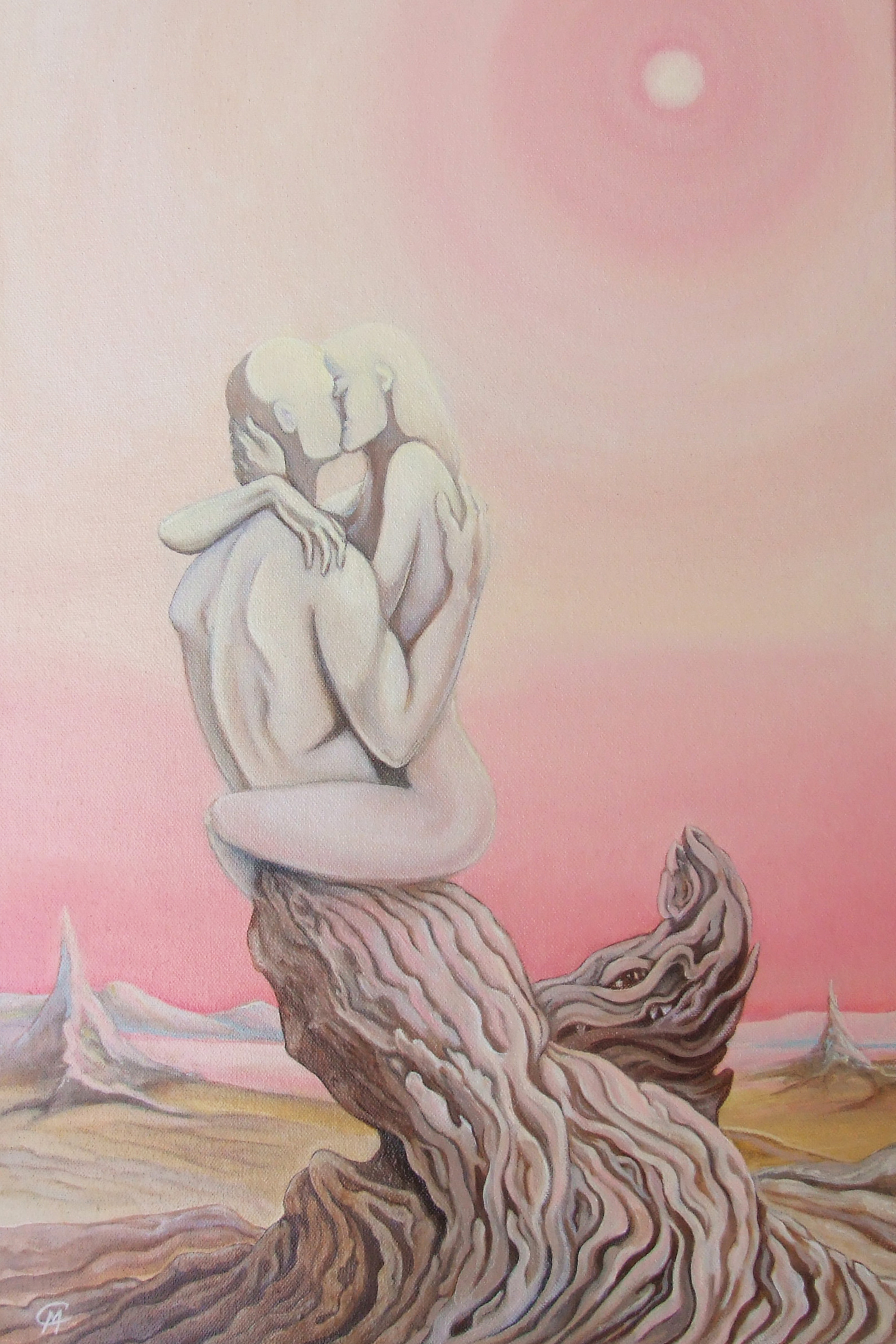 Двое влюблённых под солнцем в объятиях друг друга, в страсти и любви, под влиянием чувств и солнечного сияния камень плавится и превращается в живую плоть. Может, именно так появились первые люди на Земле?