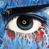 On a blue background, an eye is depicted, from which energy emanates, shaping the surrounding space. Below, in niche-caves, silhouettes of monks practicing meditation can be seen. Above the eyebrow is a prayer in Sanskrit — the "Heart Sutra," which removes obstacles on the path to enlightenment.