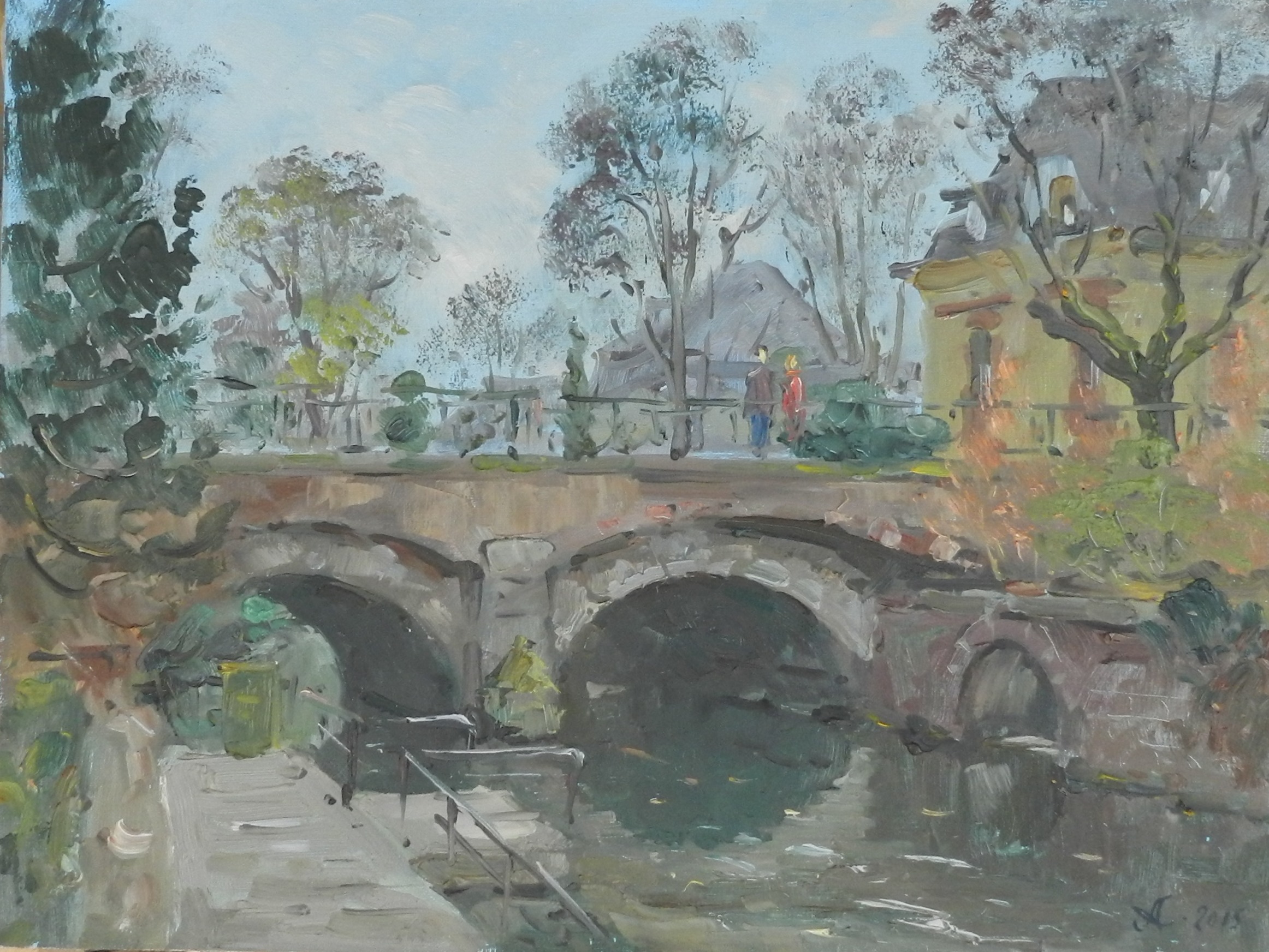 The painting “Squid Bridge” conveys the atmosphere of a quiet corner of the urban landscape, preserving the charm of ancient architecture. The central element is a stone bridge with two arches, thrown over a calm flow of water. Its massiveness and rough texture contrast with the surrounding natural backdrops, as well as the accents of architectural structures.