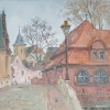 The background of the painting is full of architectural details - pointed spires of churches, graceful facades and bare tree crowns, giving the scene a light autumn or early spring melancholy. Soft pastel colors used by the artist create a feeling of peace and warmth.