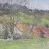 The bare branches of the trees emphasize the off-season and slight restraint of color, and soft shades of green, gray and terracotta create a harmonious combination. The background opens up to a view of the hills and small details of the village, gradually dissolving in the haze.