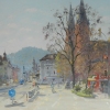 The painting "Freiburg" conveys the morning atmosphere of a lively European town. The center of the composition is the majestic spires of the church, towering over the houses, symbolizing the historical and architectural heart of Freiburg. The building is surrounded by trees with thin branches, through which the soft morning light shines.