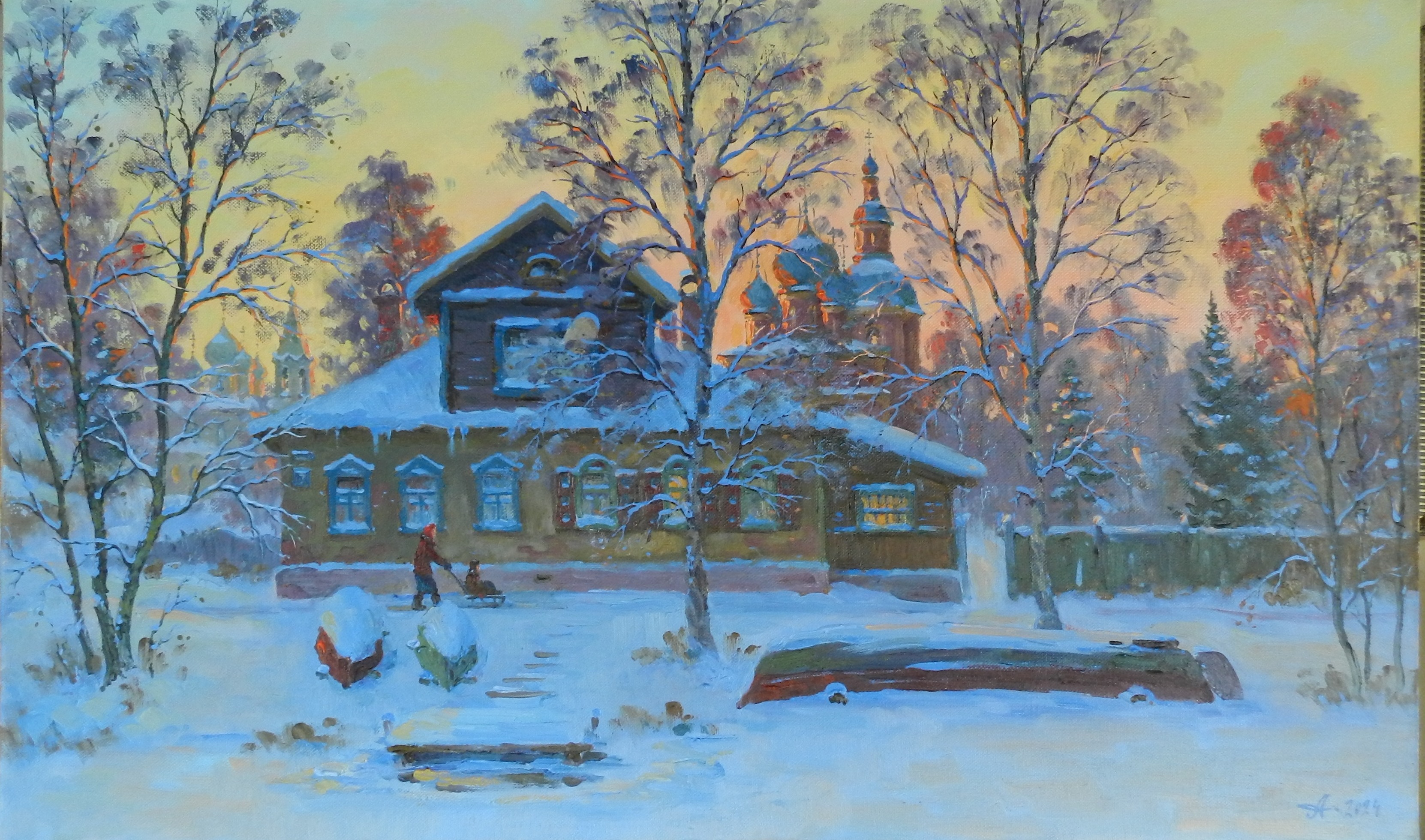 Snowy trees, a boat by the shore and the texture of soft snow convey a sense of peace and unity with nature. The painting is filled with peace, warmth and a little nostalgia, embodying the eternal connection of man, architecture and Russian nature.