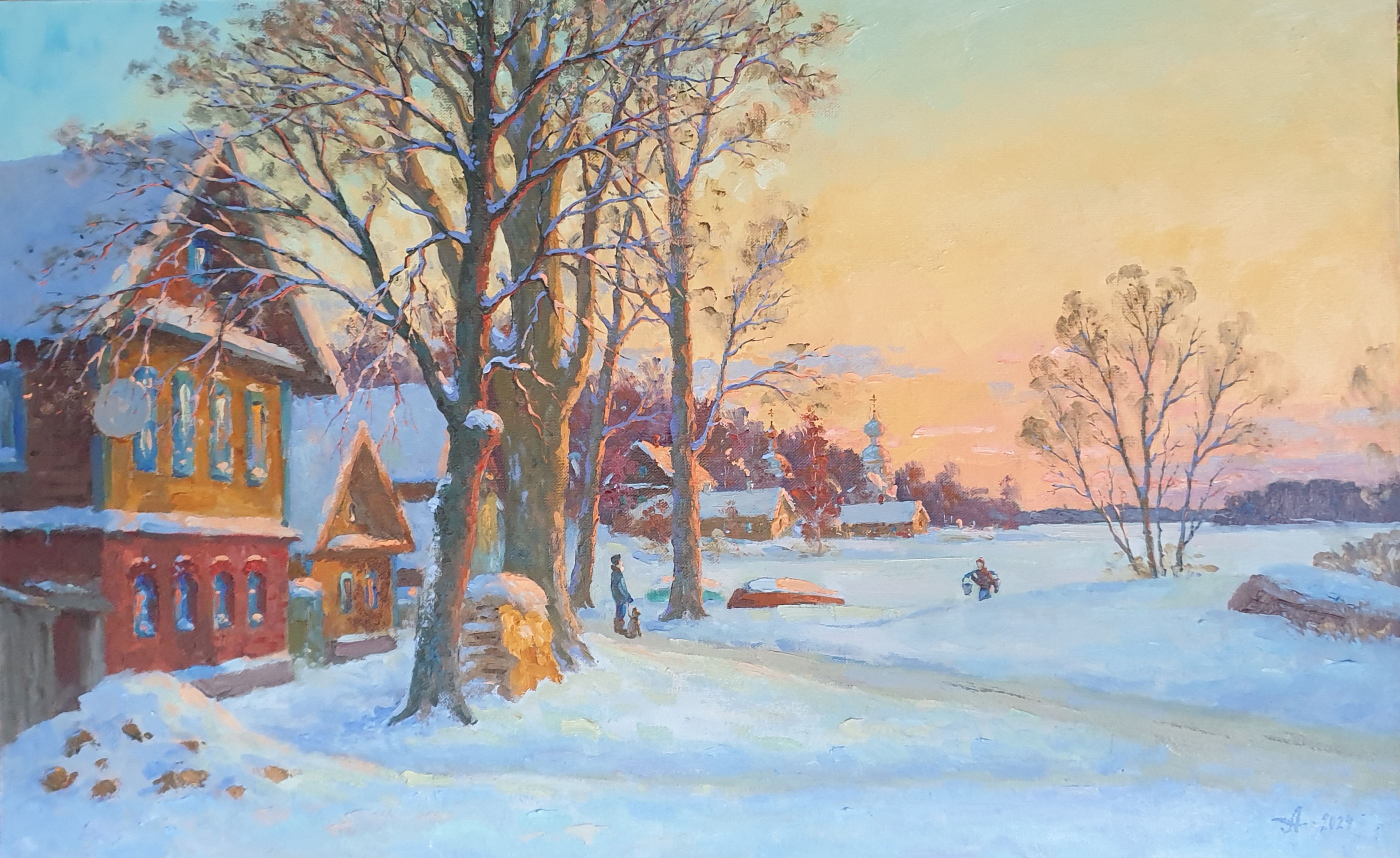 In the foreground are snow-covered houses with characteristic architecture, surrounded by trees whose branches are wrapped in frost. The silence of the winter morning is enlivened by details: figures of people going about their daily business, and sled tracks on a snowy field. A church dome is visible on the horizon, adding a special harmony and spiritual peace to the landscape.