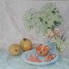The painting "White Pomegranate" is created in the genre of still life and brings a sense of freshness, lightness and grace to the space. The composition is centered around juicy pomegranates, one of which is cut open, revealing bright ruby grains. They lie on a simple white plate, becoming the center of attention due to their rich color, which contrasts with the overall airy palette.