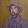 The painting "Selbstporträt" immerses the viewer in the artist's honest and profound look at himself. The canvas depicts a man in a hat and simple work clothes. His serious gaze is directed straight at the viewer, creating a sense of a casual, yet meaningful dialogue.