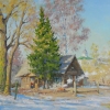 The painting "Izborsk. March" conveys the charm of early spring, when nature gradually awakens after its winter sleep. In the center of the composition is a wooden village house, from which streams of light smoke are drawn, creating a cozy atmosphere of life and warmth. Next to the house, a person busy with everyday affairs is visible, which adds realism and warmth to the painting of village life.