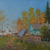 The painting "Tikhvin. October" conveys the atmosphere of a warm and bright autumn in a quiet province. The main characters of the landscape are simple village houses surrounded by a natural palette of autumn shades. A green-blue house with a wooden roof in the foreground stands out against the background of golden birches and dark crowns of spruce, creating a feeling of warmth and comfort.