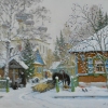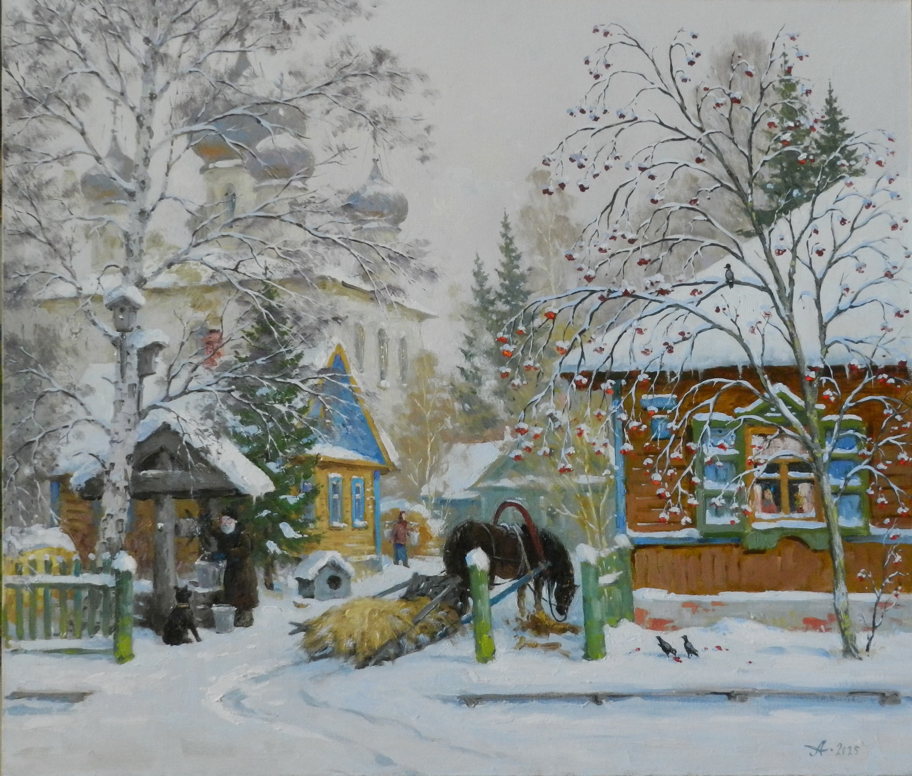 Details of village life add liveliness: a man doing business at the well, cheerfully cooing birds walking along the road, and elements of everyday life, such as fences and a dog house. Everything in this painting fills the air with winter peace, harmony and warmth of care for simple joys.
