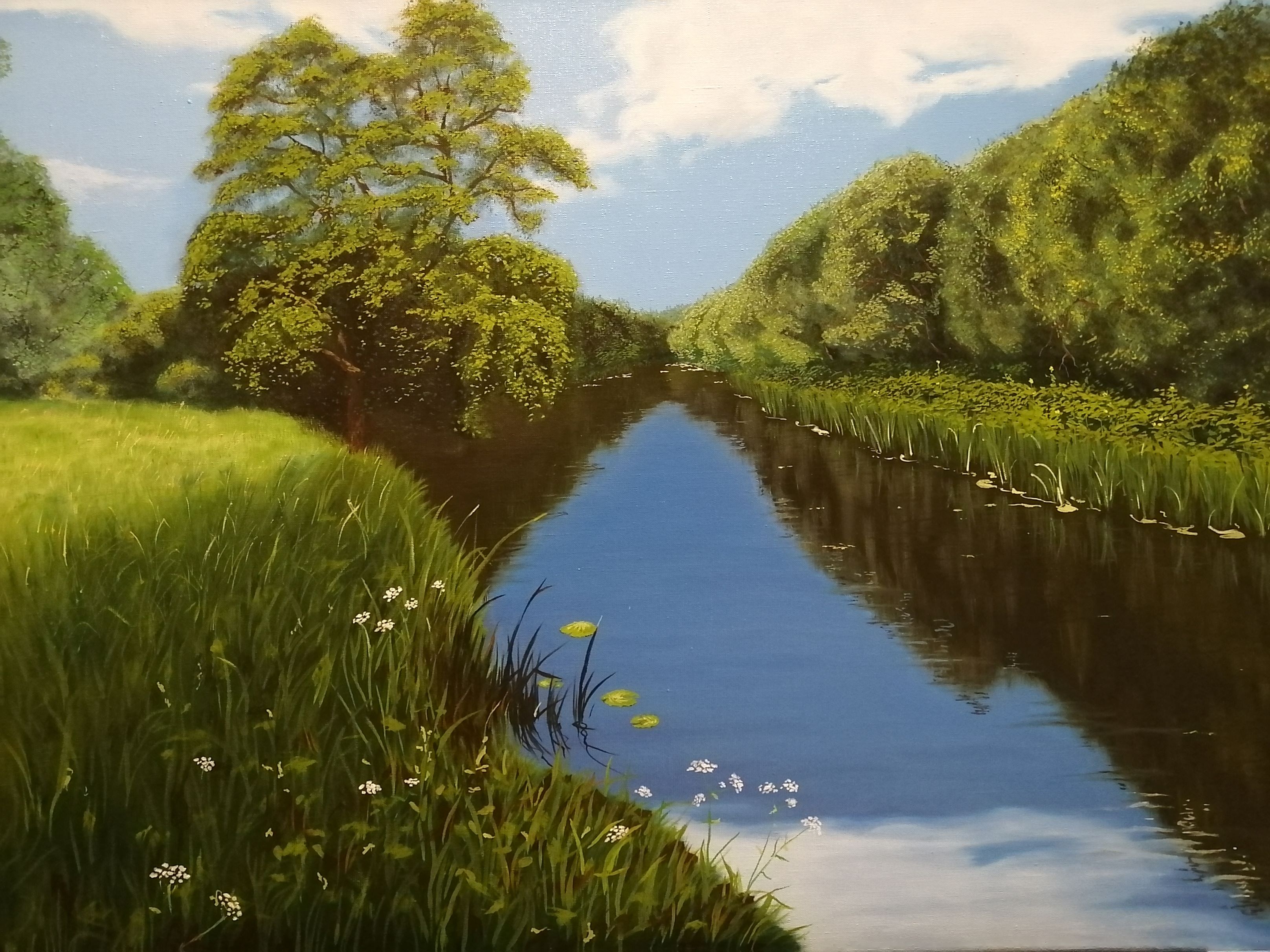 Композиция картины построена вокруг водной артерии — спокойного тёмно-синего канала или реки, которая уходит прямо вглубь полотна, создавая сильную перспективу и ощущение бесконечности. Водная гладь идеально отражает небо и окружающую зелень, что придаёт сцене глубину и многомерность.
