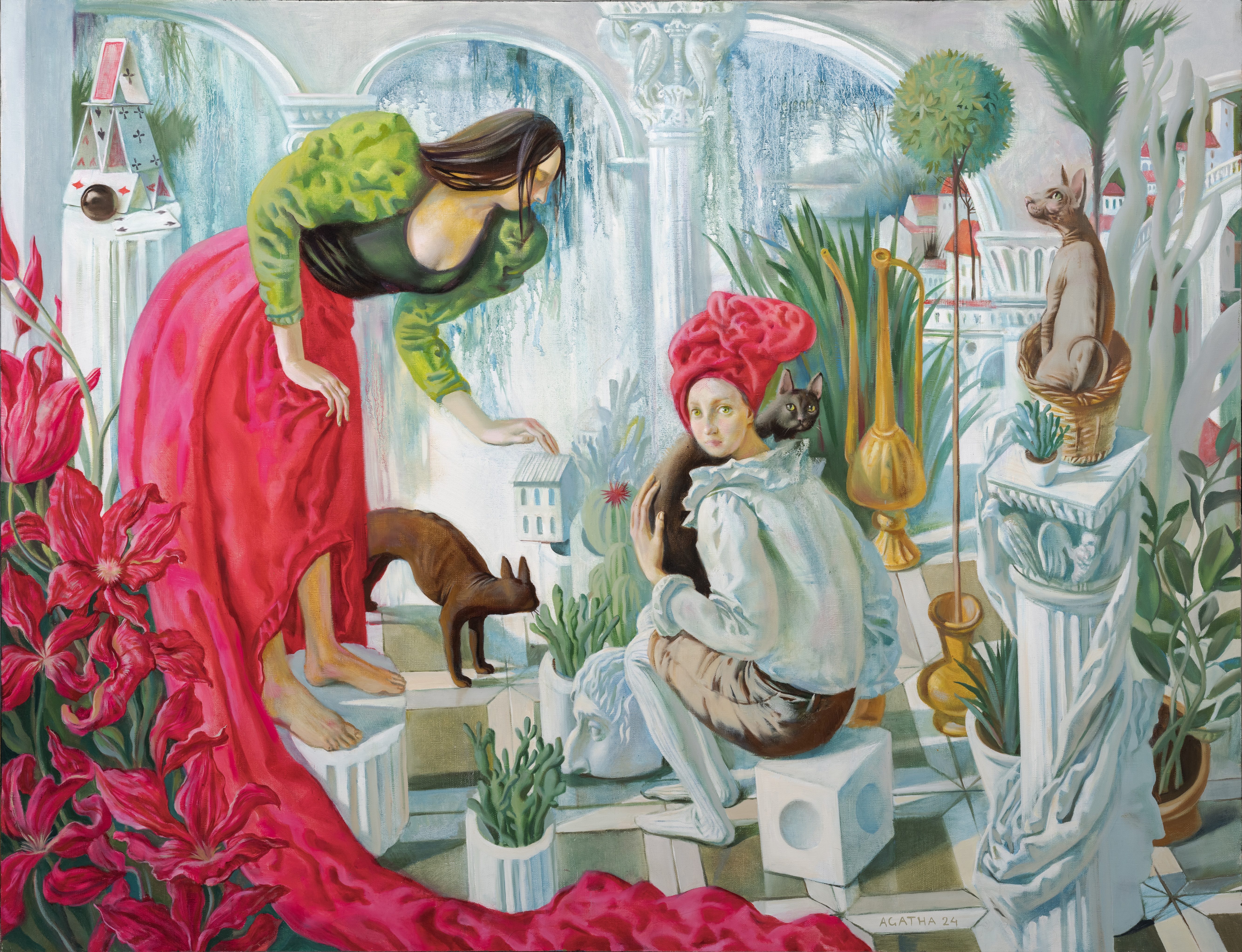 Agafya Belaya’s painting “Fantasy” transports the viewer to an exquisite, semi-enclosed space reminiscent of a greenhouse or the ruins of an old villa, filled with a dense, almost tangible atmosphere of mystery. The artist masterfully blends elements of classical painting with a whimsical, fairy-tale world.