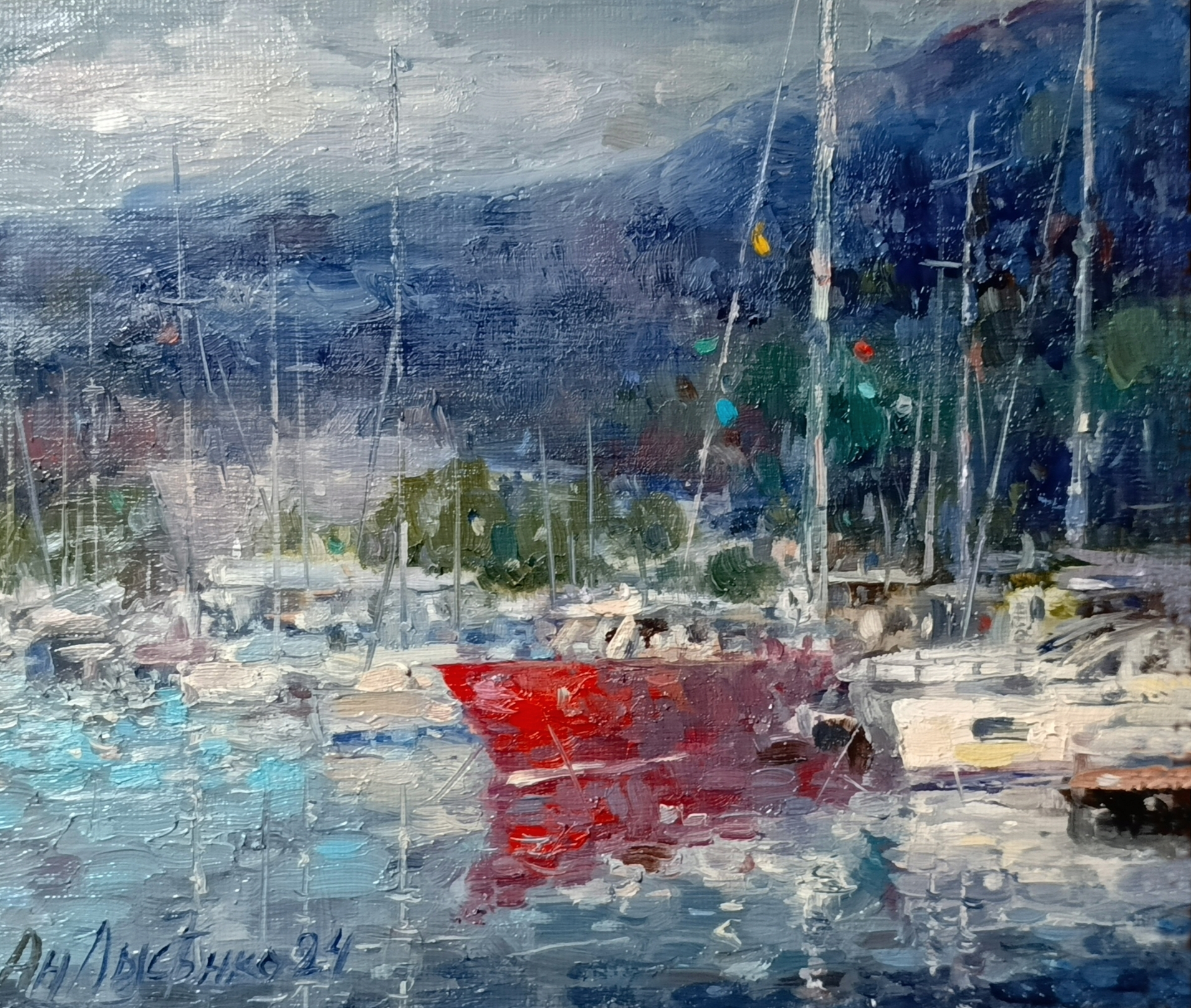 The painting “Red Yacht” brings to life a seascape in a harbor, where the daily rhythm of coastal life is captured in subtle brushstrokes and play of light. Among the many boats and masts, merging with the airy haze and deep blue tones of the background, a bright red yacht stands out. It becomes the center of the composition, attracting the eye and filling the scene with energy and contrast.