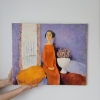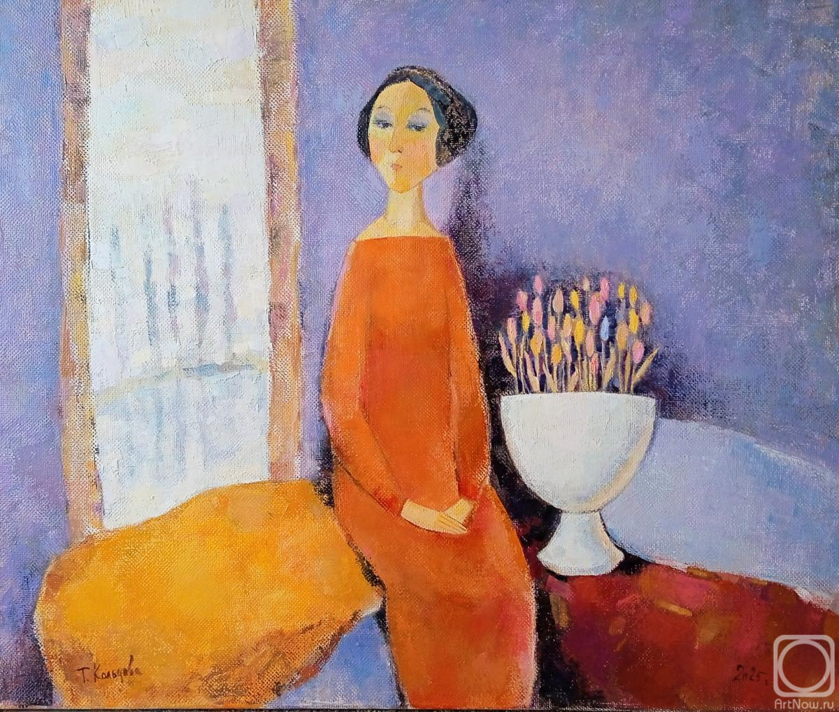 Tatyana Koltsova’s palette in this work is restrained but expressive. The combination of a deep lilac background, the bright orange dress, and warm yellow tones in the drapery creates a cozy yet expectant atmosphere. The artist skillfully plays with color to convey the subtlest nuances of mood.