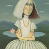 The central figure is a bride in a traditional white dress with a full skirt and veil. Her face, rendered in the artist’s characteristic style, with large blue eyes and slightly parted lips, conveys mixed emotions: hope, excitement, and perhaps a hint of anxiety. The golden necklace adds a festive touch to the image, yet it seems to be the only bright ornament, emphasizing the purity and simplicity of the attire.