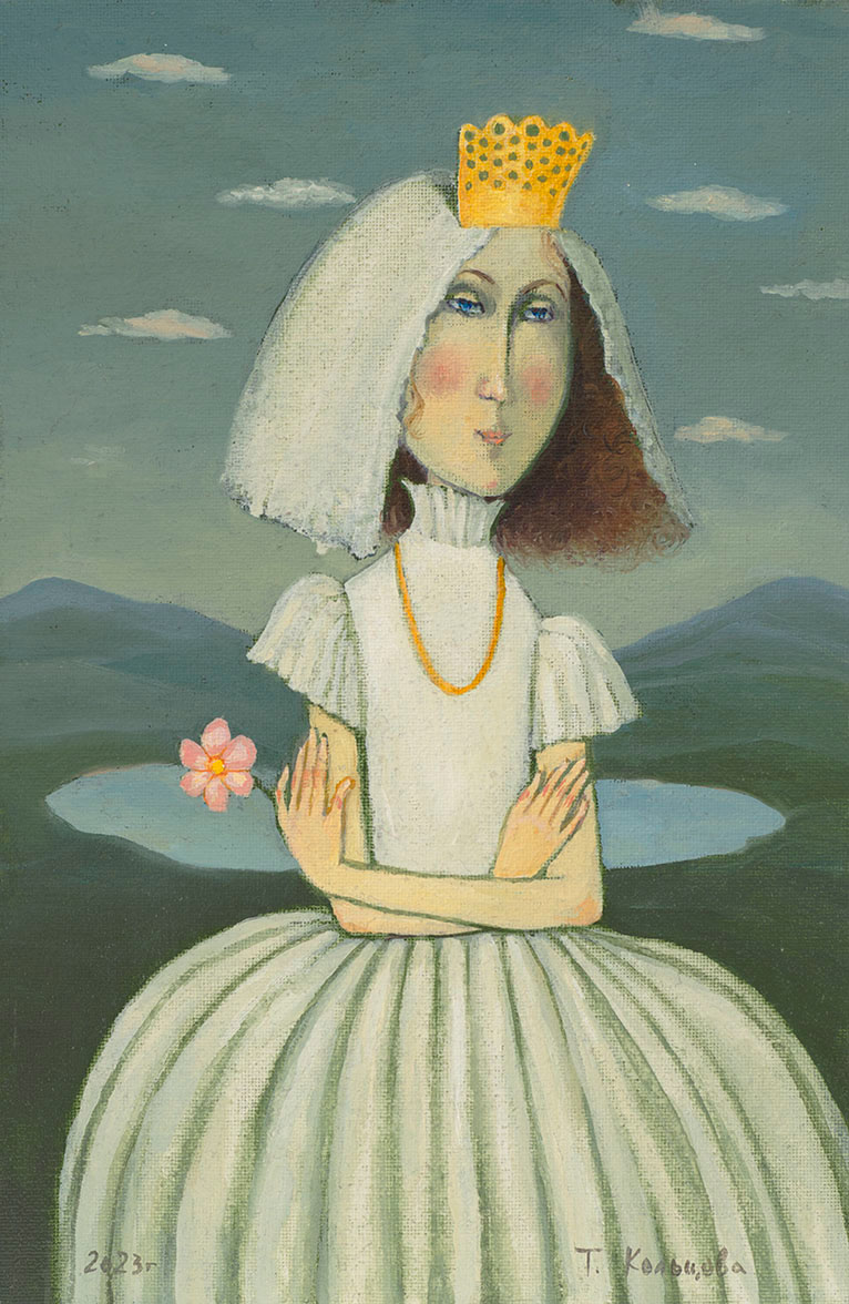Tatyana Koltsova’s painting «Невеста без места» is a deeply symbolic piece that touches on themes of anticipation, uncertainty, and the search for one’s path. The image of a girl in a wedding dress with a mysterious gaze and a slight blush on her cheeks creates a sense of mystery, and the title of the work only enhances this enigma.