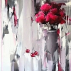 The painting "Evening Still Life" fills the space with an atmosphere of elegant minimalism and refined harmony. In the foreground, three bright red cherries stand out, resting on a light surface, like a symbol of the simple joys of life. In the center of the composition is a bouquet of rich red flowers in a tall vase, which brings a bright accent and contrast to the calm, neutral background.