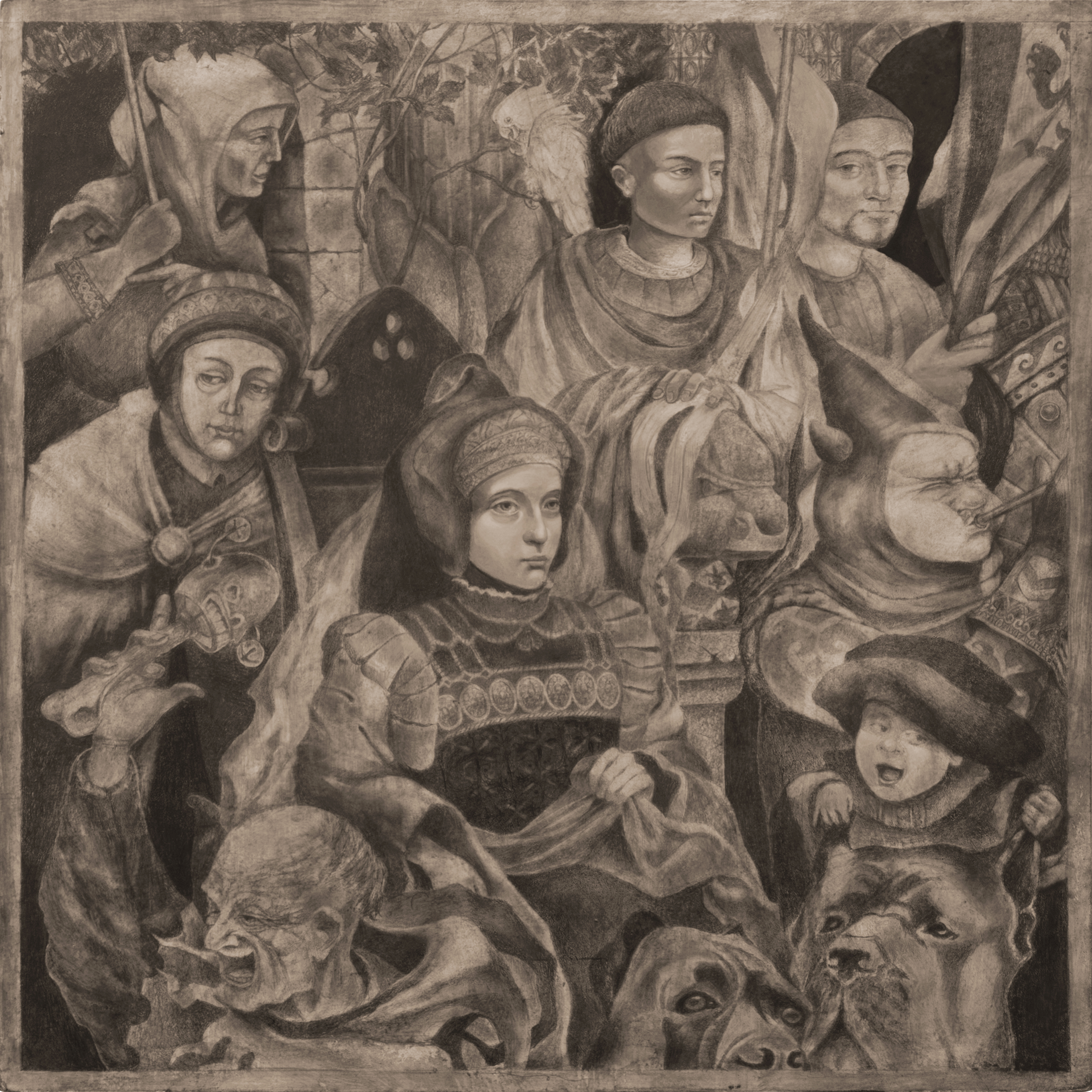 At the center of attention is a group of people whose faces and figures are rendered with astonishing detail. Their costumes, headwear, facial expressions—all speak of belonging to a certain era and social class. Here are noble ladies, knights, jesters, and possibly commoners observing the scene. Their gazes, full of curiosity, focus, or hidden excitement, create a sense of presence.