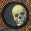 Surrounding the central image is rich symbolism. Grapevines and clusters of grapes, traditionally associated with fertility, abundance, and life itself, contrast with the depiction of the skull. The leaves, some of which are already beginning to wither, hint at the changing seasons, the natural cycle of which human existence is a part.