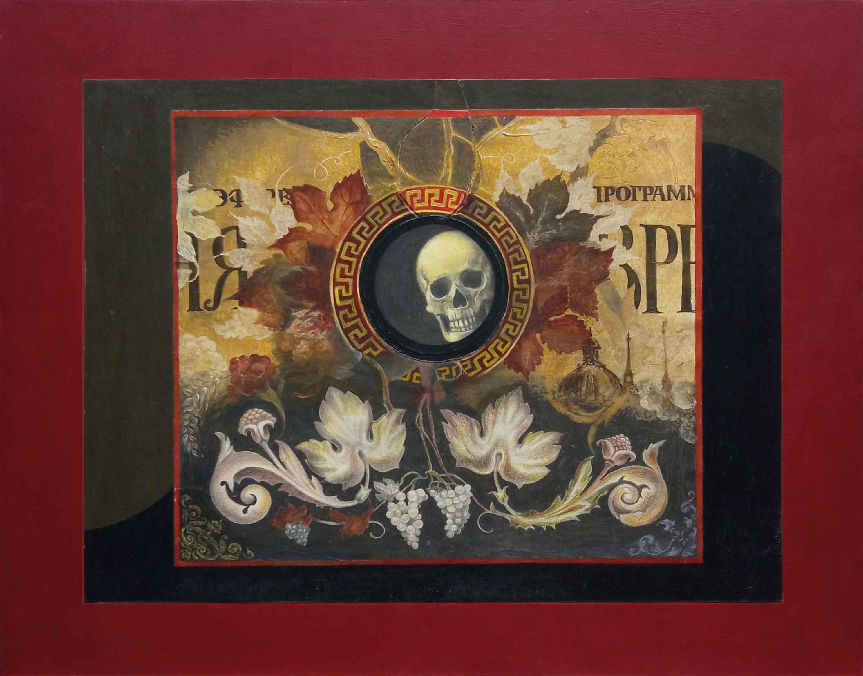 The painting by Pavel Korzukhin “Time Forward” presents an intriguing composition where symbols of life and death, past and future, intertwine into a single whole. At the center of the canvas, in a medallion adorned with classical Greek ornamentation, lies a skull – an unchanging symbol of the transience and fleeting nature of human life.