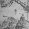 Above the city, over the spires of buildings, unusual airships hover. One of them, resembling an old sailing ship, is mounted on a complex metal structure that looks like a gate or arch. Further away, hot air balloons drift slowly across the sky. Birds soaring in the air add a sense of movement and vastness to the painting.