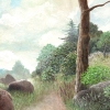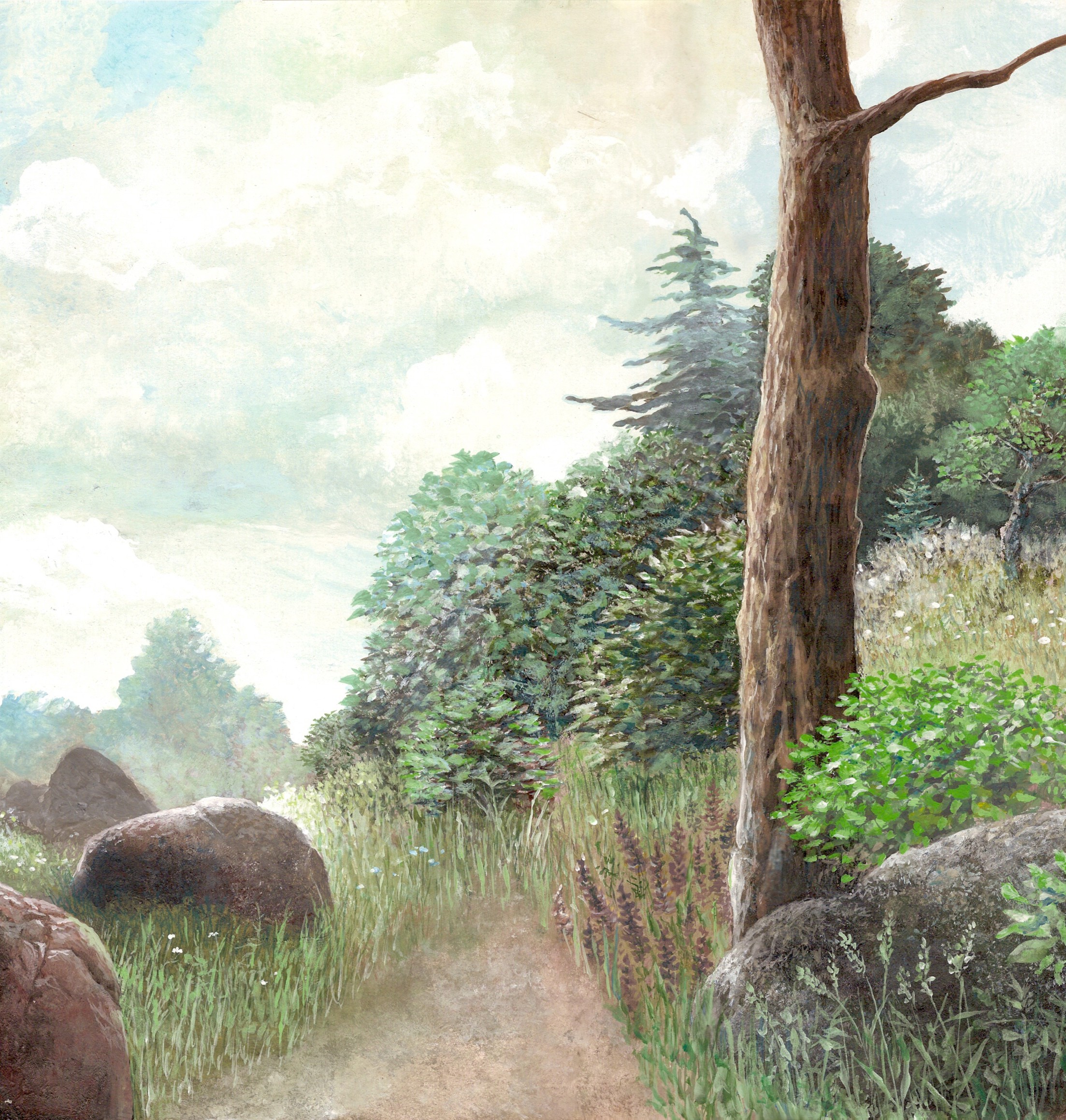 In the foreground is a path winding through tall grass and large boulders. It seems that the artist took his walks along this very path, breathing in the fresh air and admiring the surrounding beauty. Among the grass, delicate flower clusters are visible, adding liveliness to the composition and setting color accents.