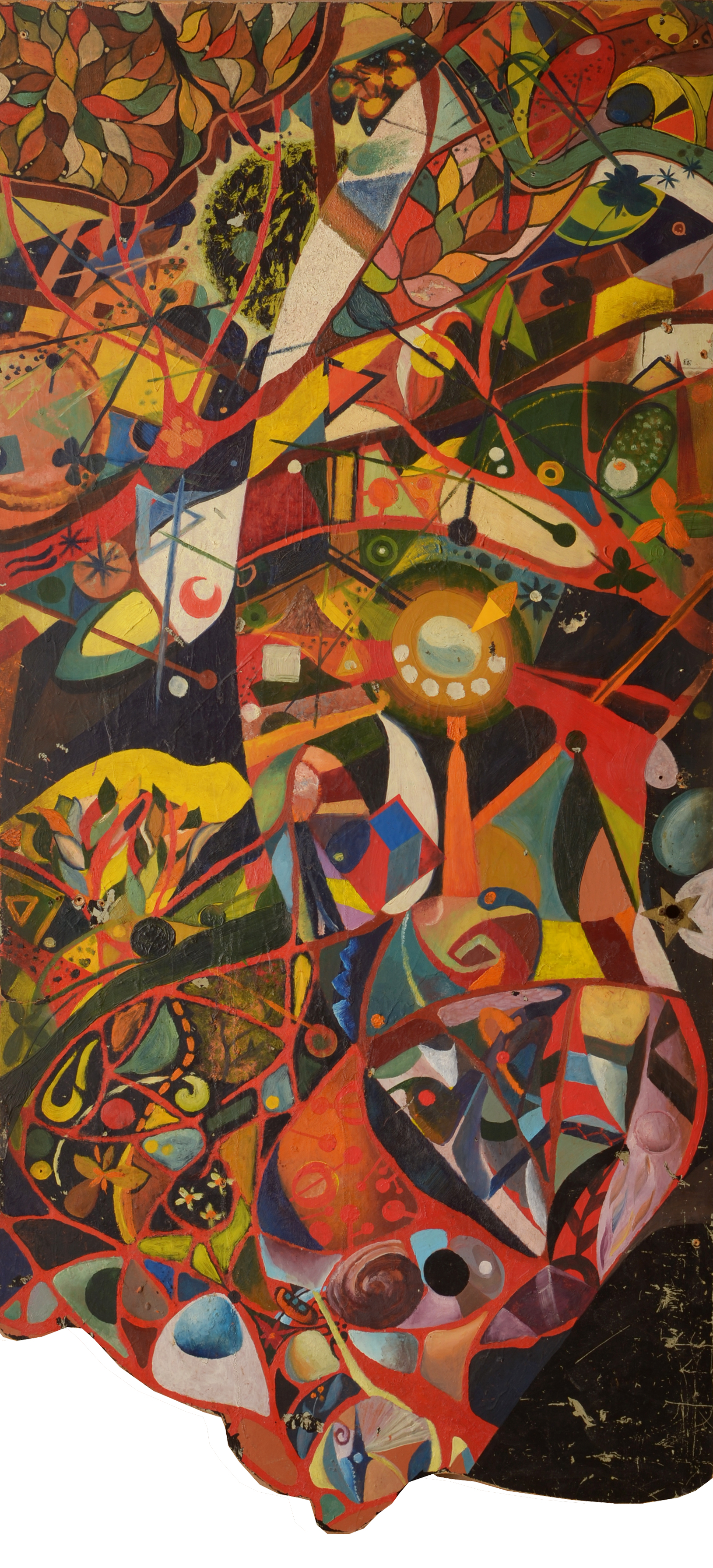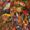 The focus is on bright, saturated colors: red, yellow, orange, blue, green. They collide and intertwine, creating dynamic compositions. The artist uses a variety of geometric shapes — circles, squares, triangles — as well as more organic, flowing lines that evoke natural motifs while remaining abstract.