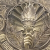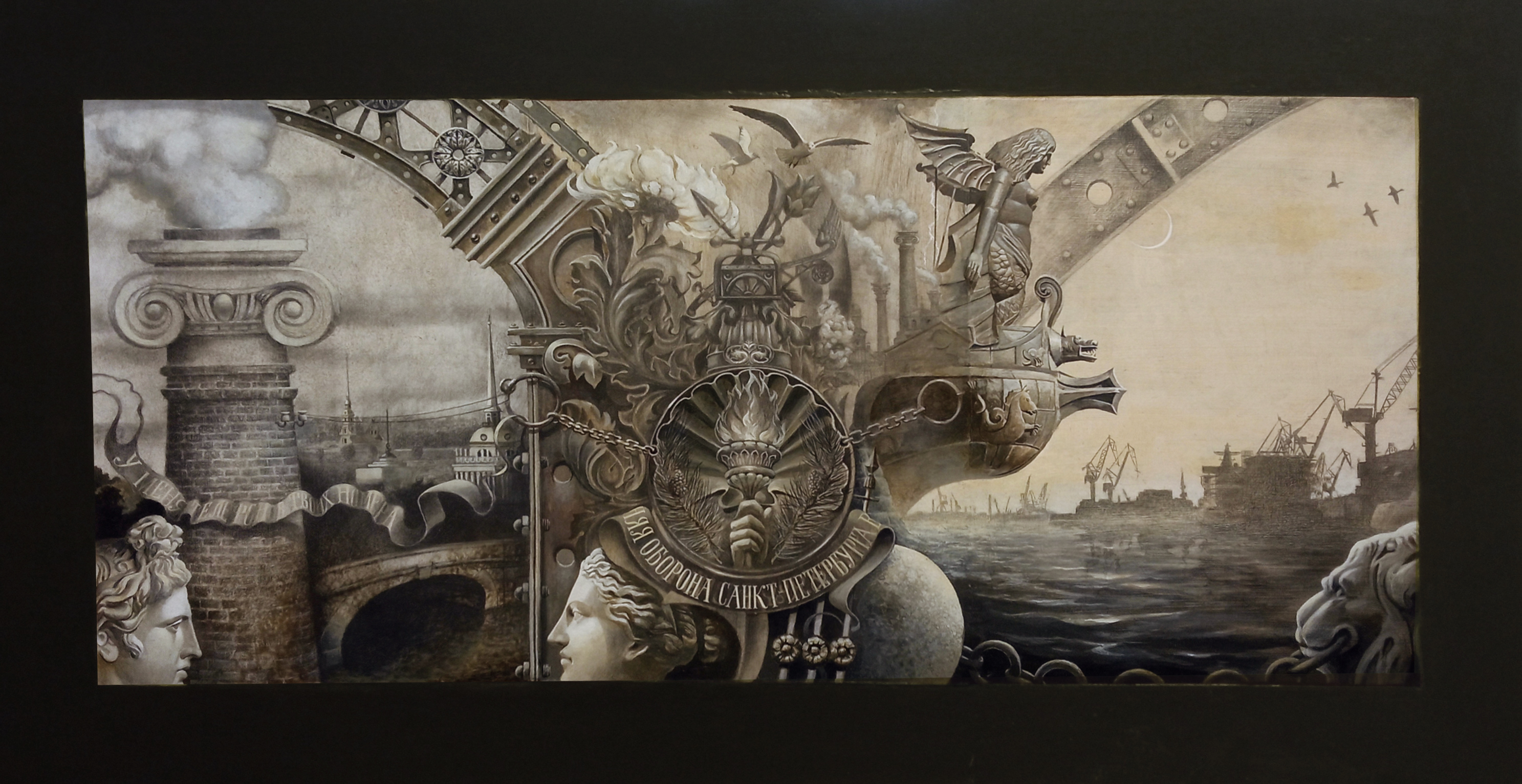 At the center of the painting is a coat of arms with a burning torch and the inscription «НАРОДНАЯ ОБОРОНА САНКТ-ПЕТЕРБУРГА» (People’s Defense of Saint Petersburg), which immediately refers to the severe trials the city endured. The face of an ancient goddess likely symbolizes the city’s eternity and grandeur despite all vicissitudes.