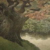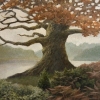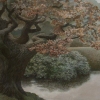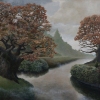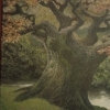 In the foreground on the left, a mighty tree spreads its sprawling branches, covered with autumn leaves in red-brown shades. Its trunk, marked by the wrinkles of time, seems to embody wisdom and resilience. To the right, in the background, another tree resembling an oak echoes it, creating a sense of harmony and symmetry.