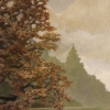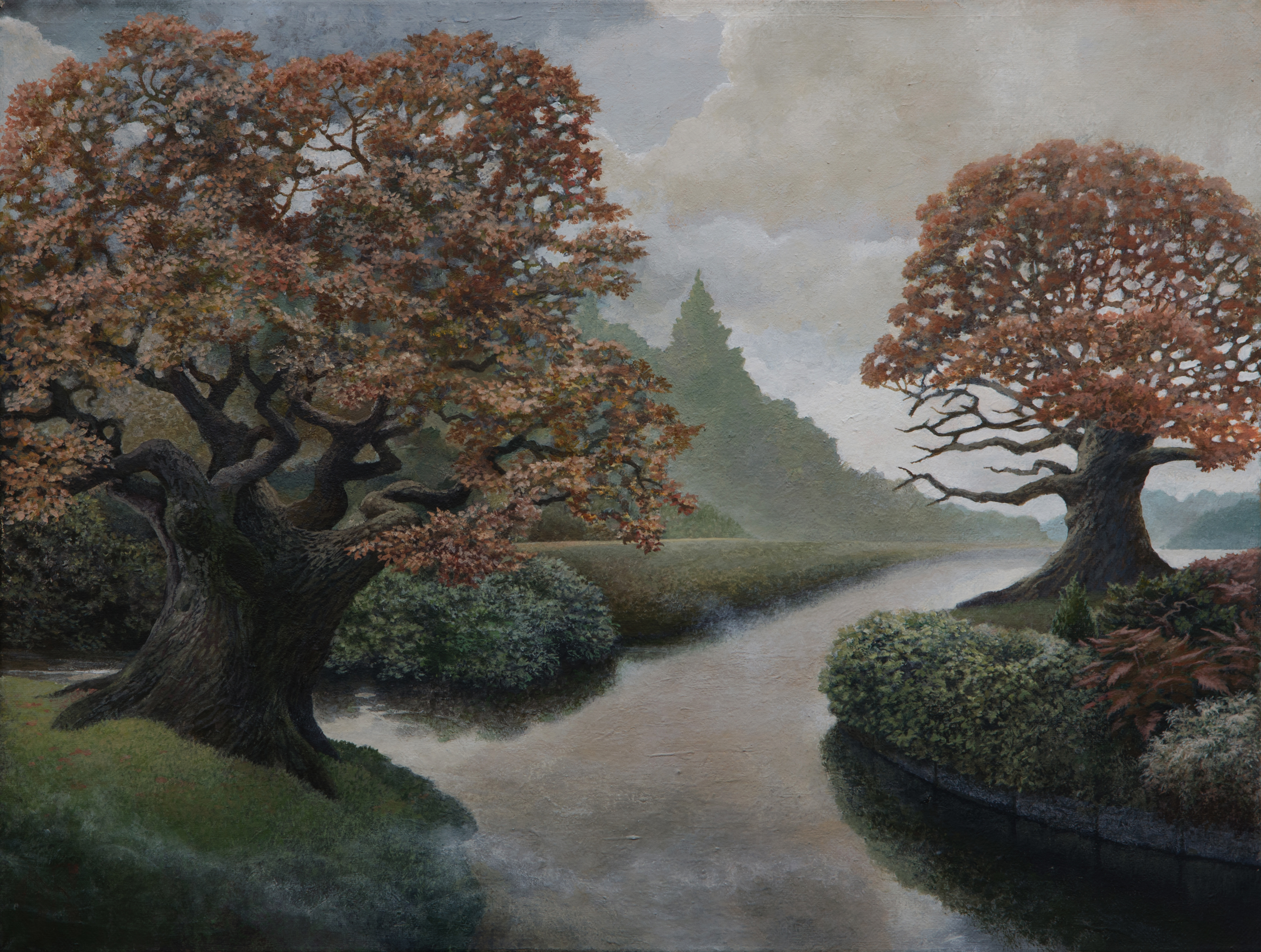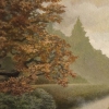Between the trees flows a calm dark river, whose smooth surface reflects the trees and the soft grayish sky. The autumn foliage on the trees, like precious decoration, adds richness and warmth to the landscape. Bushes covered with darker green contrast with the bright leaves, giving depth to the composition.