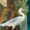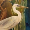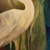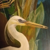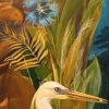 The central element of the painting is the white heron, gracefully curving its long neck. Its feathers are rendered with particular care, conveying their delicacy and lightness. The heron holds a small stone in its beak, which likely carries deep symbolic meaning. In the Art Deco style, the heron is often associated with grace, purity, and spirituality, while the stone may symbolize wisdom, knowledge, or an important element that the heron brings to the world.