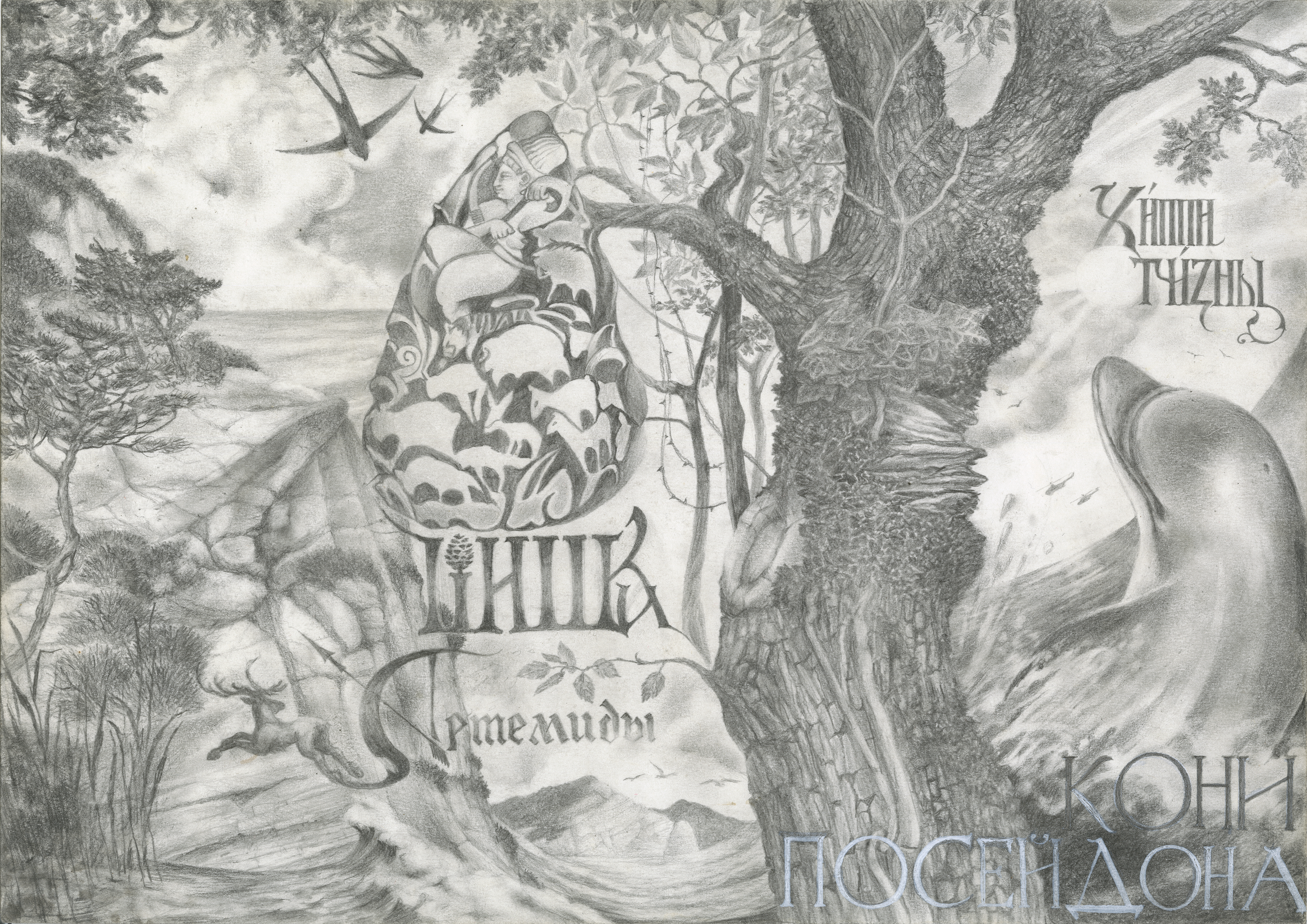Pavel Korzukhin’s work is a complex graphic parable where ancient archetypes blend with surreal images. The artist masterfully intertwines two worlds: the forest element of Artemis and the raging waters of Poseidon. At the center of the composition is the allegorical image of Artemis, whose figure seems to grow out of the earth itself, resonating with the symbolism of the «pine cone» as a sign of fertility and natural magic.