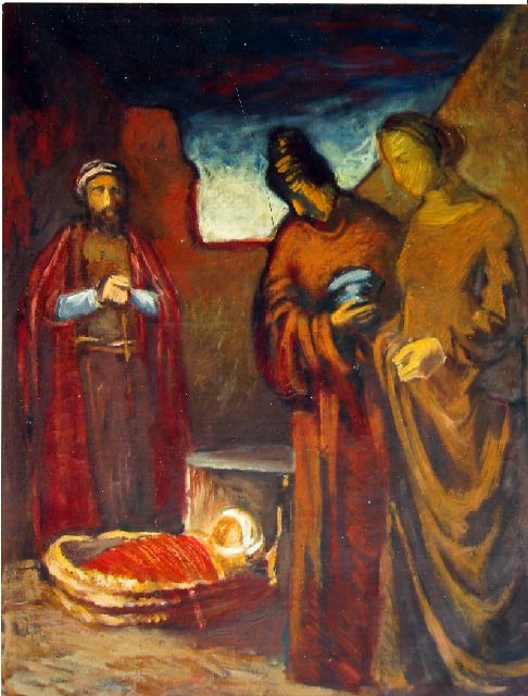The painting "Gospel Story" takes the viewer back to one of the most reverent moments of religious tradition - the Nativity scene. In the center of the composition is a baby lying in a modest cradle, around which the figures of Mary, Joseph and another character have gathered. Their poses are calm and filled with respect, expressing humility and deep spirituality.